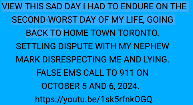 to Toronto on that Godly Visit I failed to resolve and almost went to jail for a lying nephew Mark causing my 2nd worst day of life, hearing my sister Mary telling me